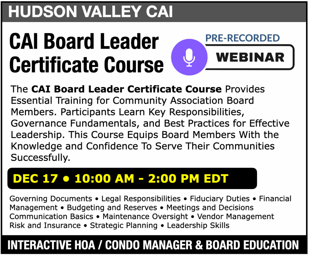 The CAI Board Leader Certificate Course offers comprehensive instruction for board members seeking to enhance their governance skills. Attendees explore fiduciary duties, operational oversight, and proven leadership strategies. Completing this course demonstrates commitment to effective, ethical, and informed community association governance.